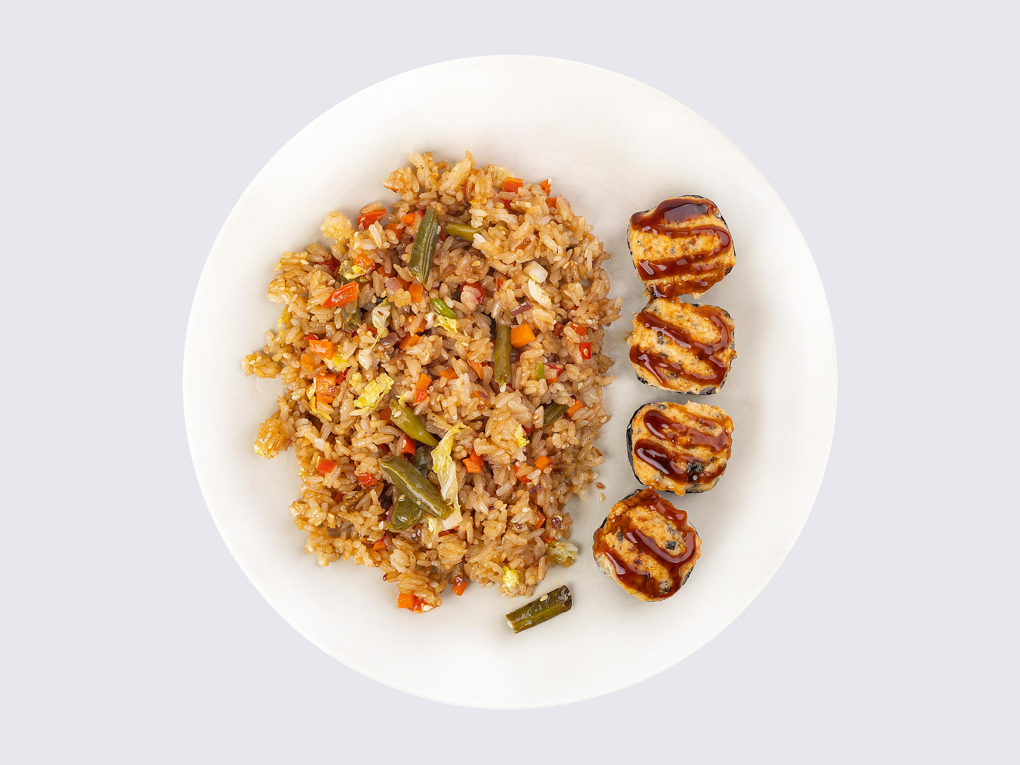 Запечённый ролл с угрём 1/2, Жареный рис с овощами